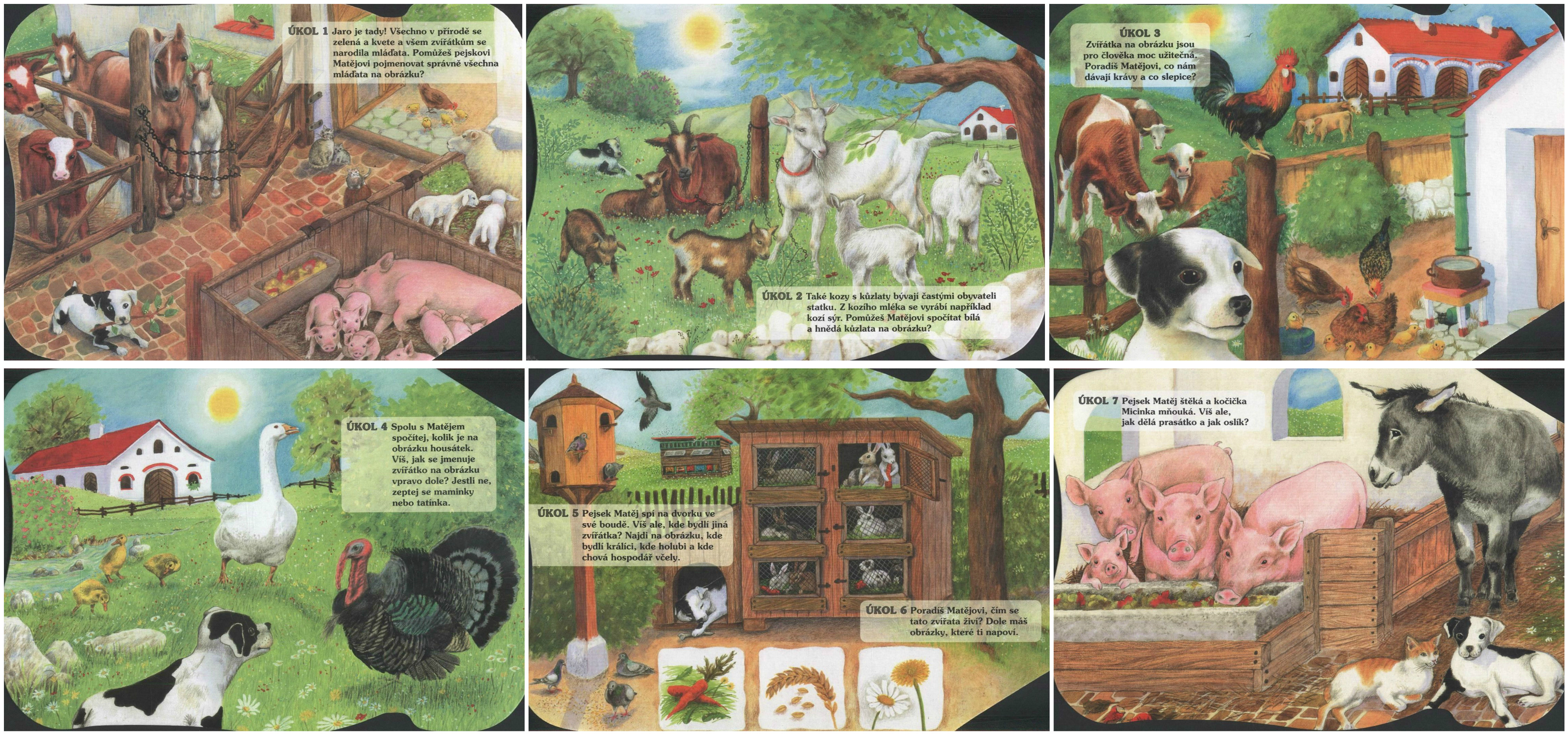 Na stolečku, o kterém jste si mohli přečíst v článku Montessori na severský způsob, jsme si udělali takovou malou domácí farmičku. V knížce se objevuje třeba pejsek Haf, kravička Bů, kozička Mé, ovečka Bé, koníček Íhahá a prasátko Chro. Všechna tato zvířátka mají i svou trojrozměrnou podobu.